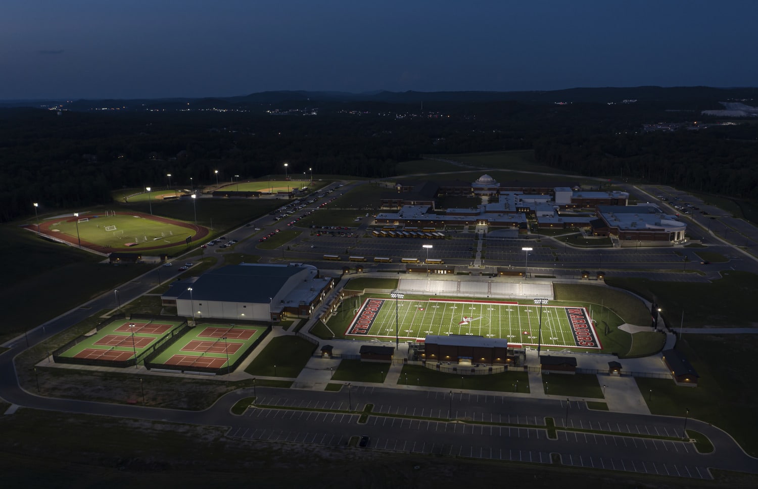 The academic side of the facility accommodates 2,000 students across 74 classrooms, 14 science labs, a 1,250-seat auditorium, a black box theater, a career academy center, and a 100-seat lecture hall. Upon completion in 2017, the campus became a model for modern education, combining state-of-the-art athletic, career tech, and fine arts facilities in a single, integrated environment.