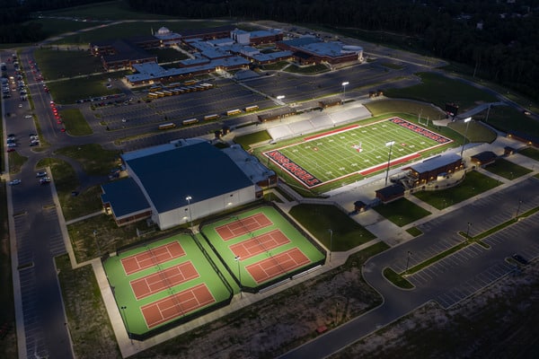 This $120 million capital improvement program included a new 380,000 square-foot high school along with renovations to existing facilities across the district. Volkert served as the program manager for the multi-year effort, which encompassed both academic and athletic infrastructure. The new Thompson High School campus includes extensive athletic amenities such as an indoor practice facility with field houses, a track and field stadium, baseball and softball stadiums, indoor batting cages, tennis courts, and a golf driving range. The program also provided five dedicated practice fields for football, soccer, band, and ROTC use. A 2,220-space parking lot was included to support student and faculty needs.